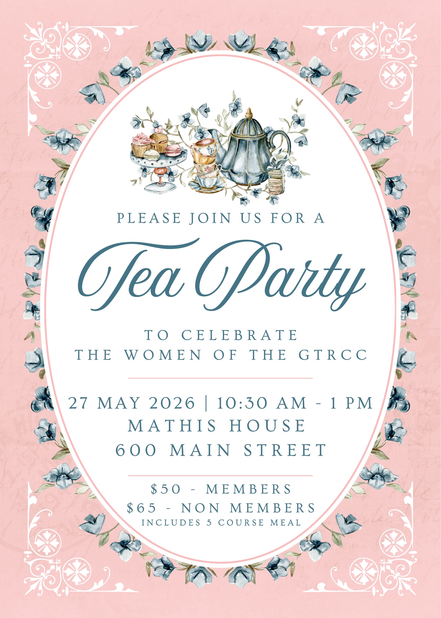 Join us for a charming Tea Party as we celebrate the wonderful women of the GTRCC. This special gathering will feature an elegant five-course luncheon, delightful conversation, and a warm atmosphere of fellowship and appreciation. Come enjoy a relaxing morning filled with delicious treats, beautiful tea service, and meaningful connection as we honor the women who make our community so special.