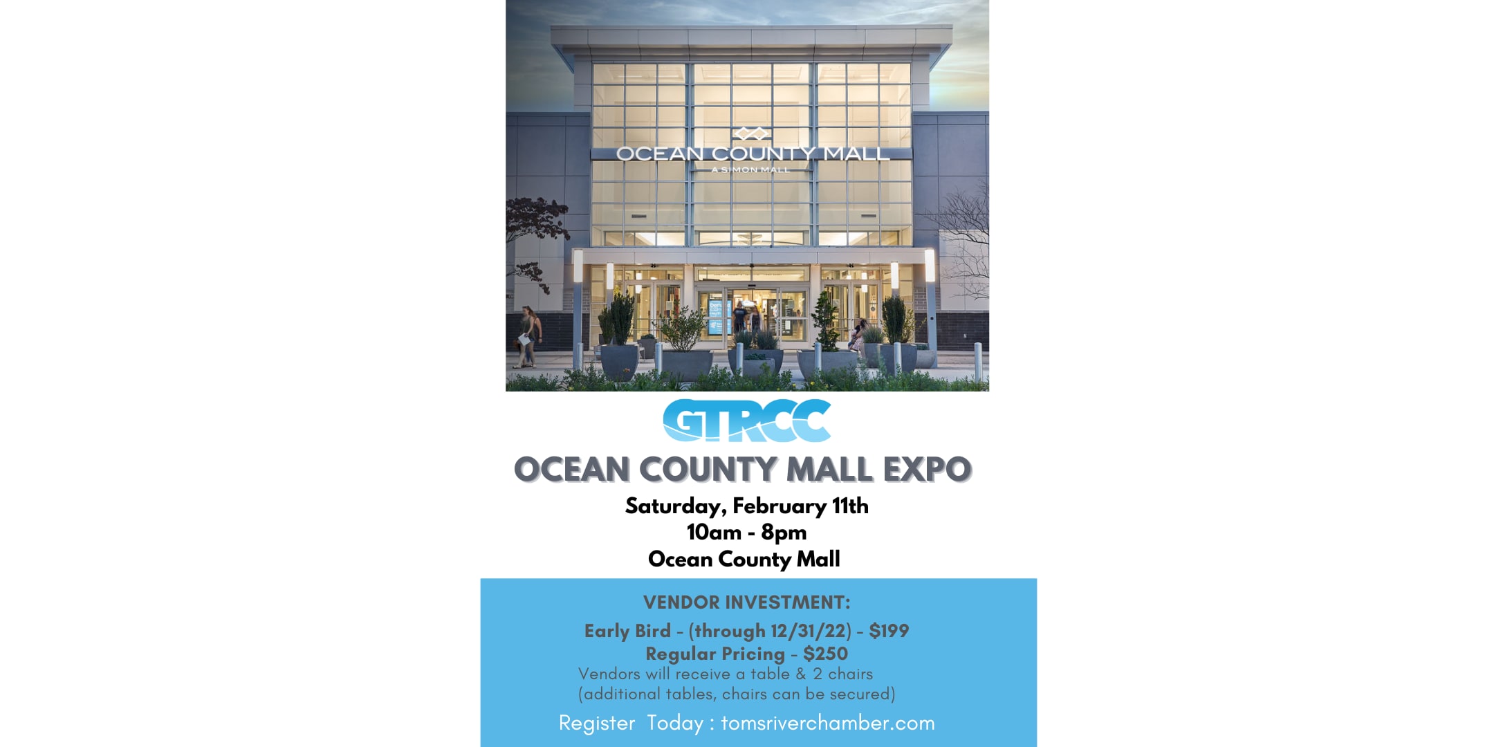Want a vendor table of your own? You can secure your spot today. Vendor investment includes a table and two chairs. Vendors are encouraged to man their table from open to close on Saturday, provide giveaways, and network. Table location is first come, first served Visit the Ocean County Mall during operating hours to talk with GTRCC member vendors from various industries.Images