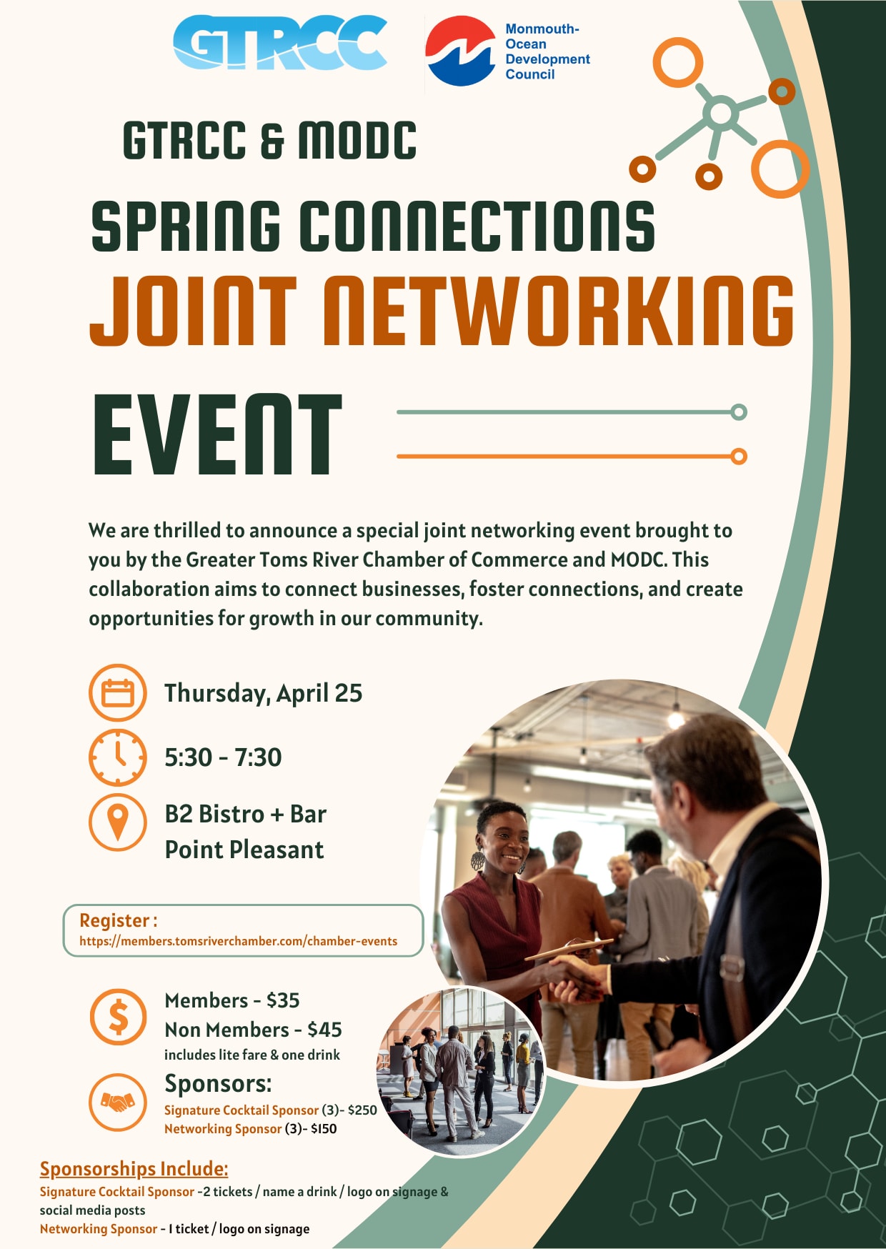 The Greater Toms River Chamber of Commerce + Monmouth Ocean Development Council invite you to a joint networking event at B2 Bistro Point Pleasant.