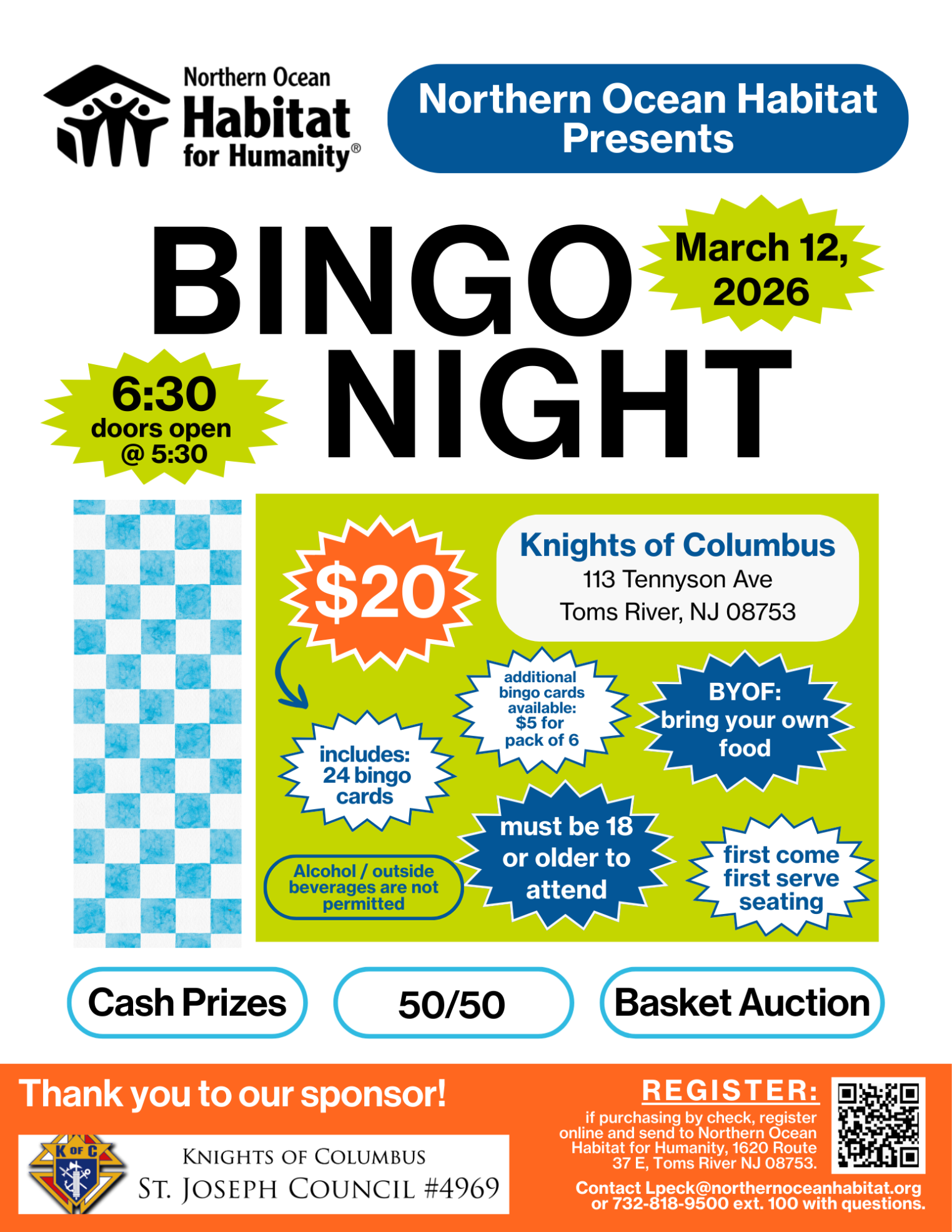 Get ready for a night of fun and fellowship and join us for our Bingo Fundraiser on March 12, 2026 — where every number called brings us one step closer to building homes, communities, and hope. Proudly sponsored by the Knights of Columbus in Toms River!