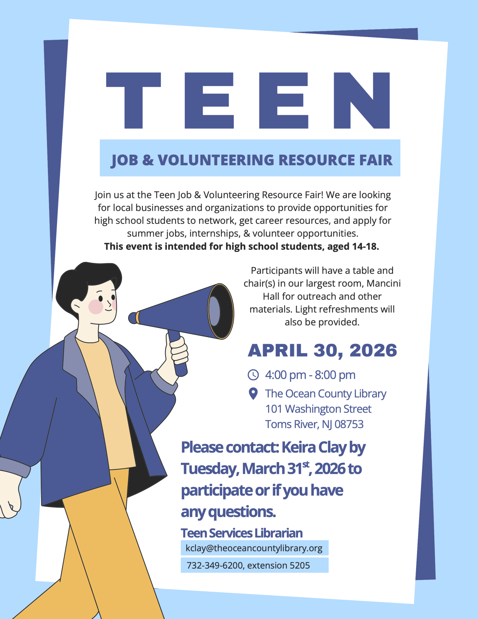 On Thursday, April 30th, The Ocean County Library in downtown Toms River is hosting a summer job, internship, and volunteering resource fair for high school-aged students. We are inviting local businesses and organizations who work with teens to come to the library for recruitment purposes. This event will also provide career resources and light refreshments. The Teen Job & Volunteering Resource Fair will take place on Thursday, April 30th from 4:00 PM to 8:00 PM in Mancini Hall at the Toms River library. If your organization offers opportunities for teens, please reach out by Tuesday, March 31st.